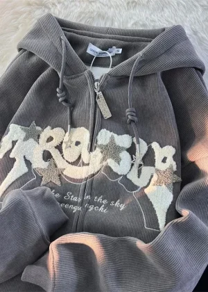 Fashion Embroidery Zip Up Hoodies Women Autumn Long Sleeve Tops Loose Hood Shirt Harajuku Y2K Clothes Female Sweatshirt Jacket